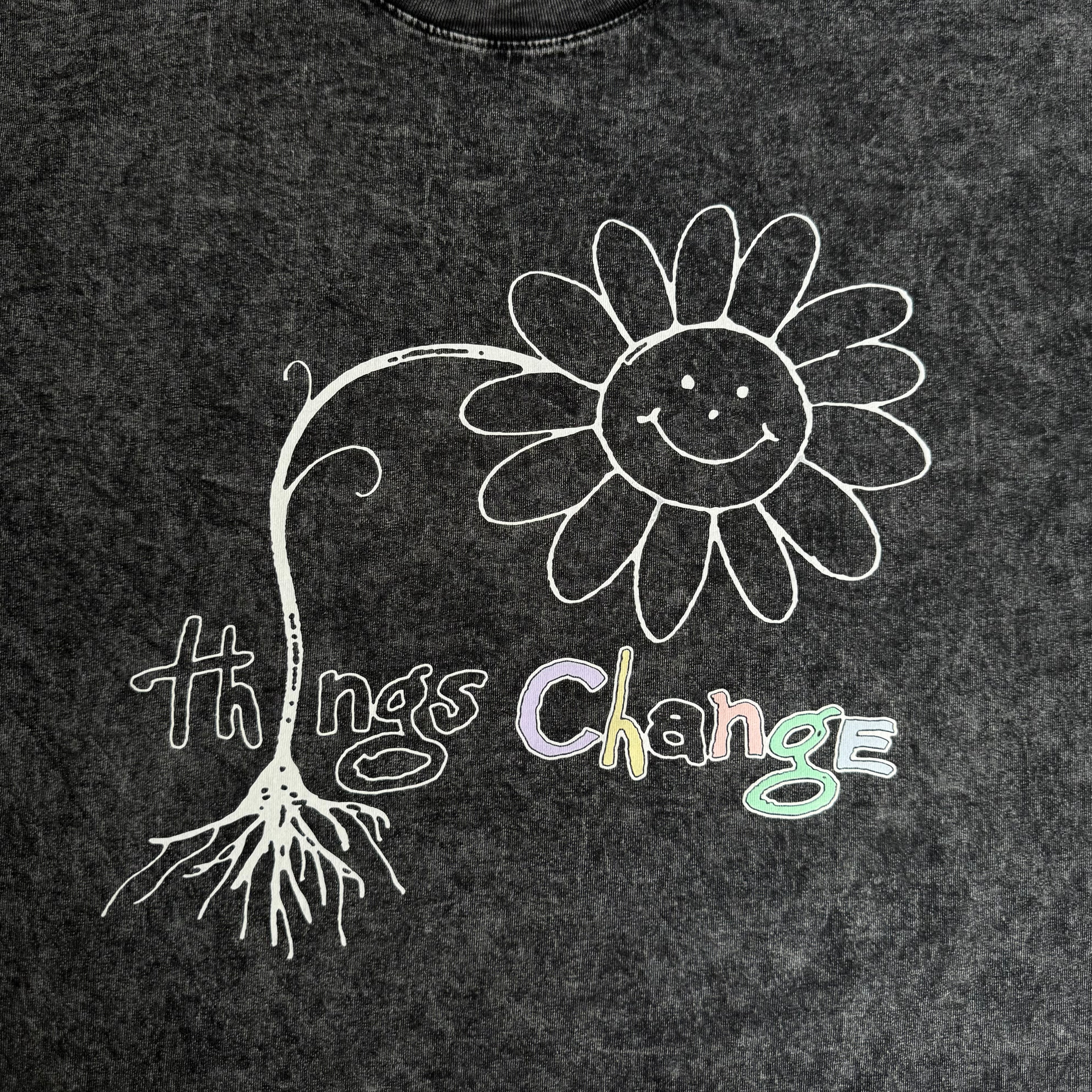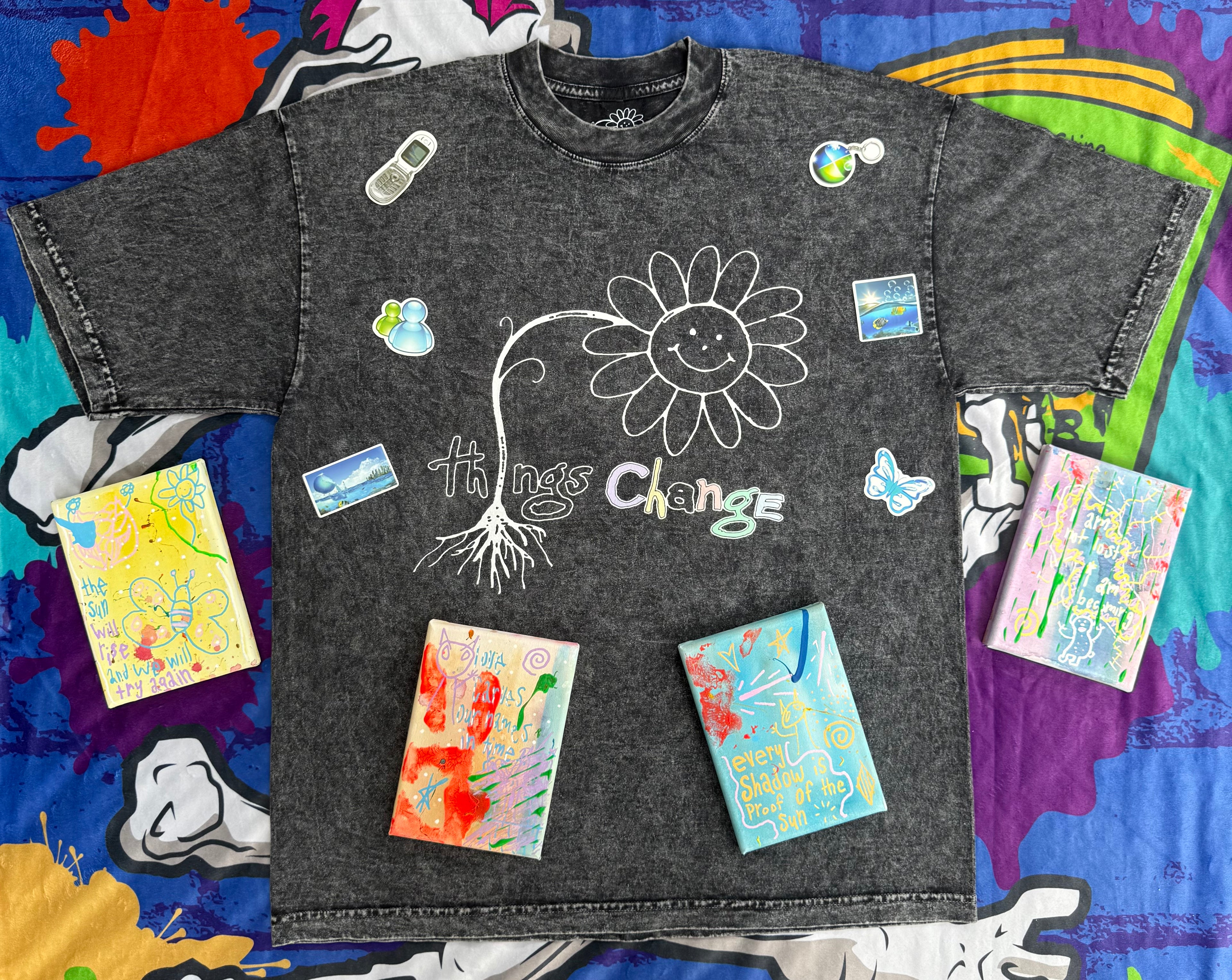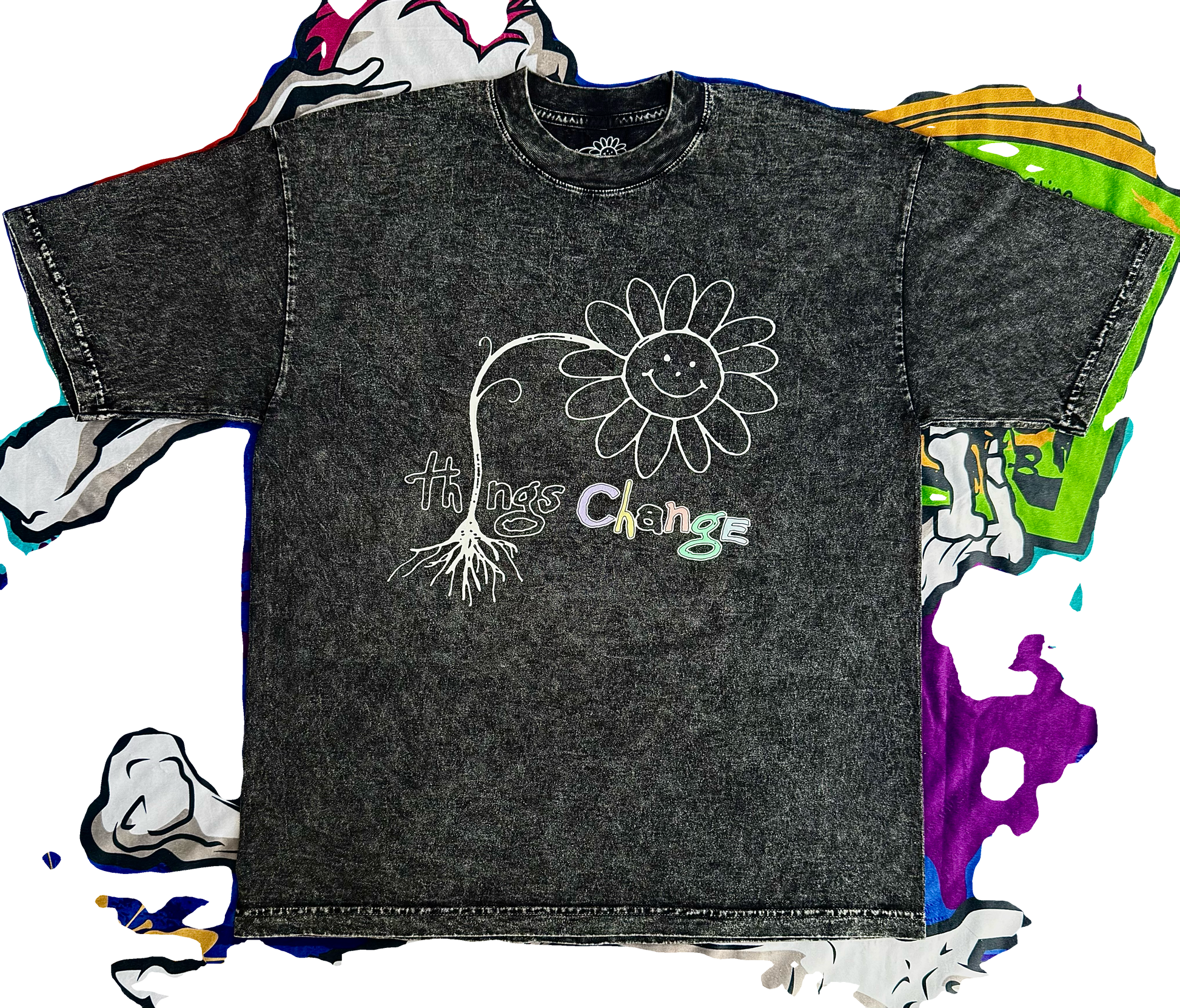 introducing the first official shirt fromthings change, screen printed on a premium 6.5oz 100% cotton tee. each shirt is garment-dyed with a unique mineral wash, giving it a vintage, lived-in feel right out of the box. every shirt comes with a surprise 1-of-1 mystery painting and free stickers, bundled with your order.